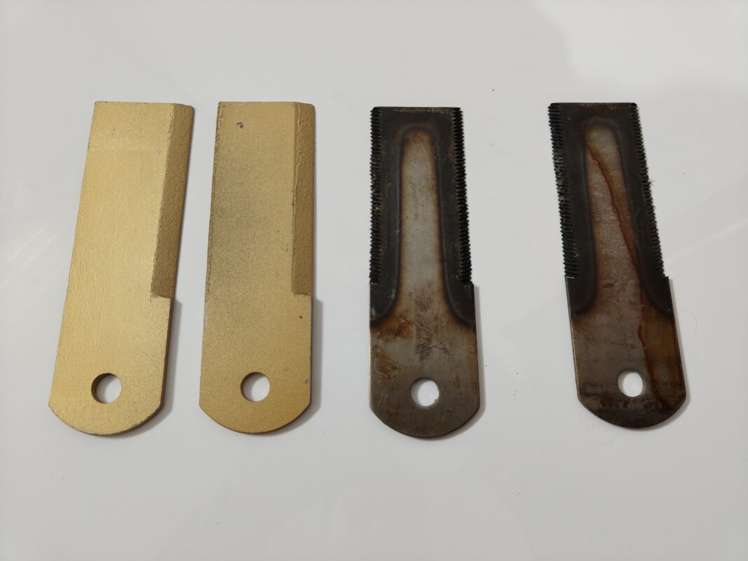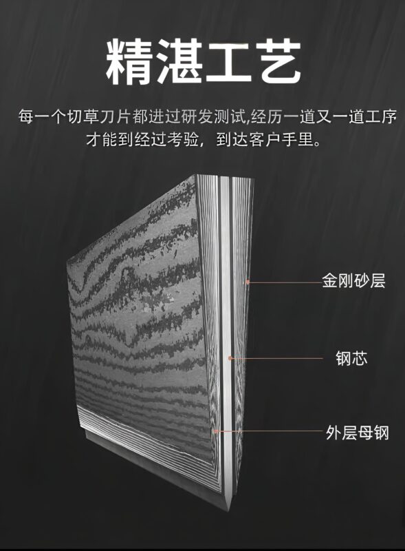 - For the blades, we use double-sided single-layer diamond plating (wear-resistant, with the diamond edge gradually exposed during use) and double-sided hardened steel (the edge becomes sharper the more it is used, suitable for tens of thousands of acres of use).