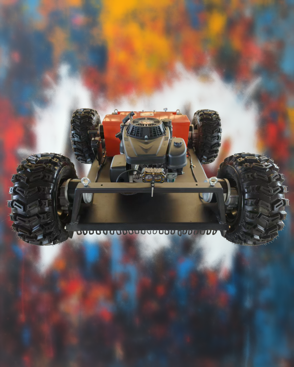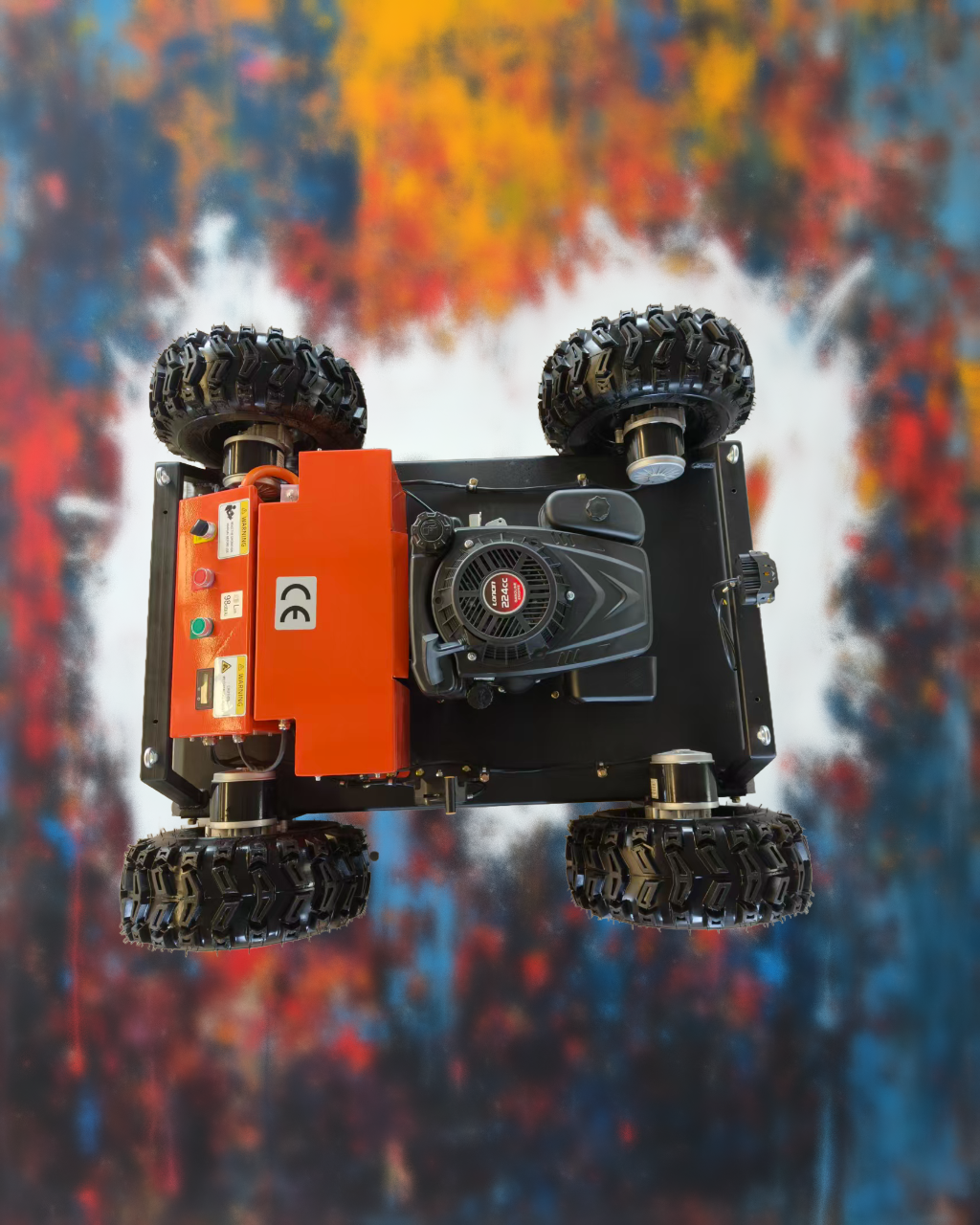 4WD remote-controlled lawn mower, equipped with a Longxin 224cc, 4.5KW electric start engine, four 24V 350W drive motors, a 28V 1500W generator, an anti-cut hard object system, and a remote control start/stop system
